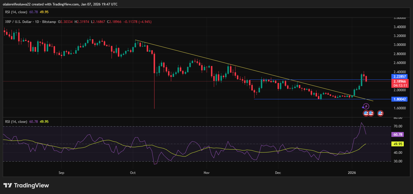 XRP enchaînait des clôtures quotidiennes dans le vert depuis le 2 janvier, signalant un regain de dynamique haussière. Cette série s’est interrompue lors des deux dernières séances, le token ayant clôturé dans le rouge, un mouvement qui semble lié à des prises de bénéfices à court terme après une cassure technique.