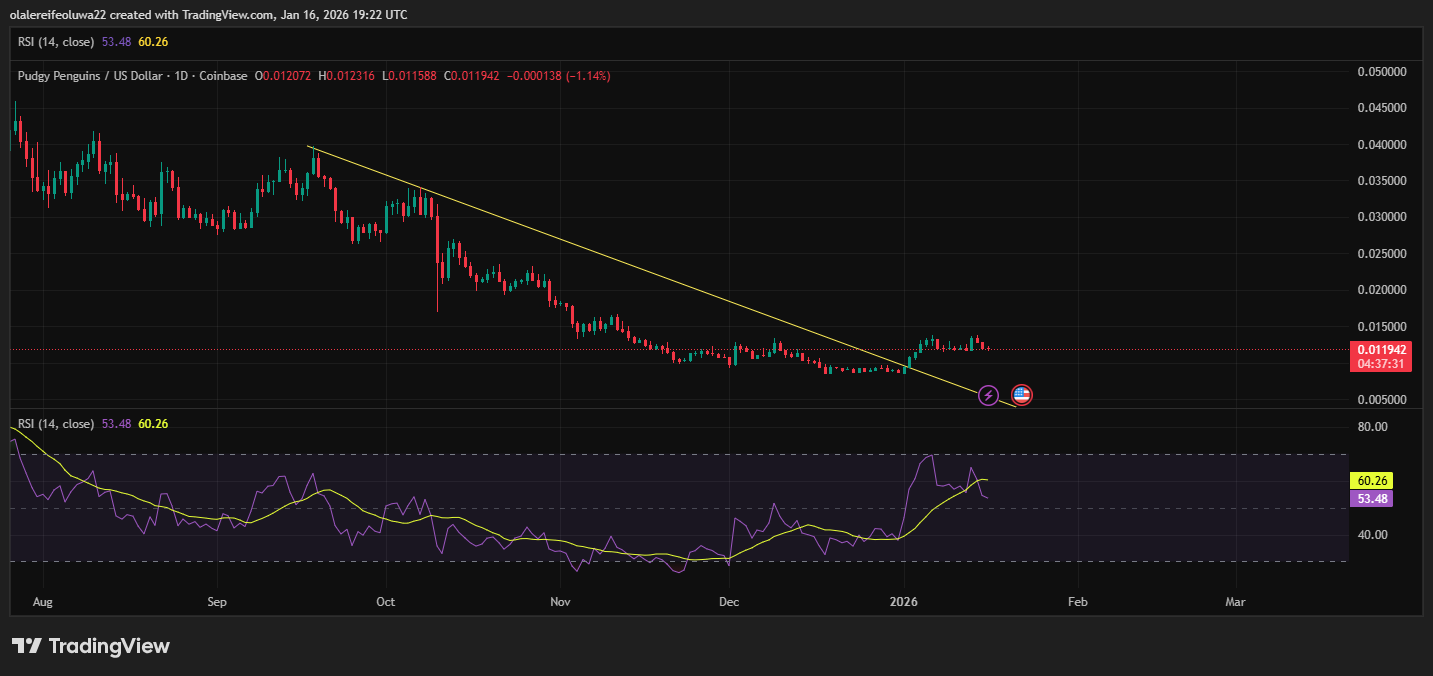 Si PENGU parvient à se maintenir au-dessus de la ligne de tendance cassée, il pourrait viser une zone comprise entre 0,014 $ et 0,016 $. En revanche, une chute sous environ 0,011 $ invaliderait la cassure et relancerait la tendance baissière précédente. Le maintien des niveaux de support clés sera déterminant pour toute poursuite du mouvement haussier.