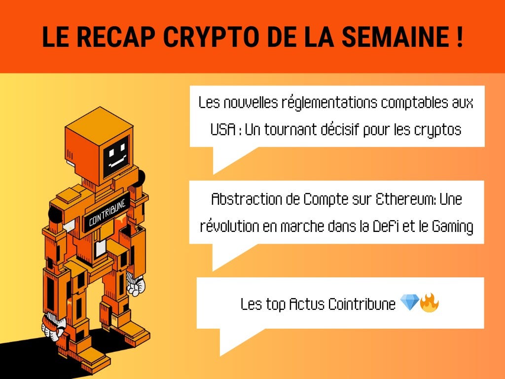 Nous débuterons avec un zoom sur les nouvelles réglementations comptables aux États-Unis et leur impact sur le marché des cryptos. Ensuite, nous explorerons l'abstraction de compte sur Ethereum et son potentiel révolutionnaire dans la DeFi et le Gaming. Et comme toujours, nous clôturerons avec notre "Récap de la semaine", où nous vous présenterons les gros titres qui ont fait sensation.