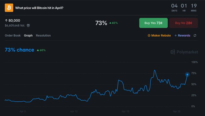 Dans le même temps, les attentes augmentent. La plateforme de prédiction Polymarket montre désormais que les traders donnent au Bitcoin 73 % de chances d’atteindre 80 000 $ avant la fin du mois d’avril. Ce chiffre a fortement augmenté depuis le début du mois, reflétant un optimisme croissant alors que les prix se stabilisent.
